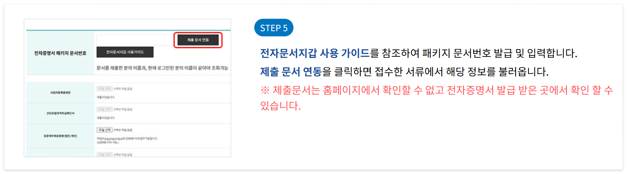 - 패키지 문서번호 발급 후 입력하거나, 서류 직접 첨부하여 필요한 정보를 제출합니다.