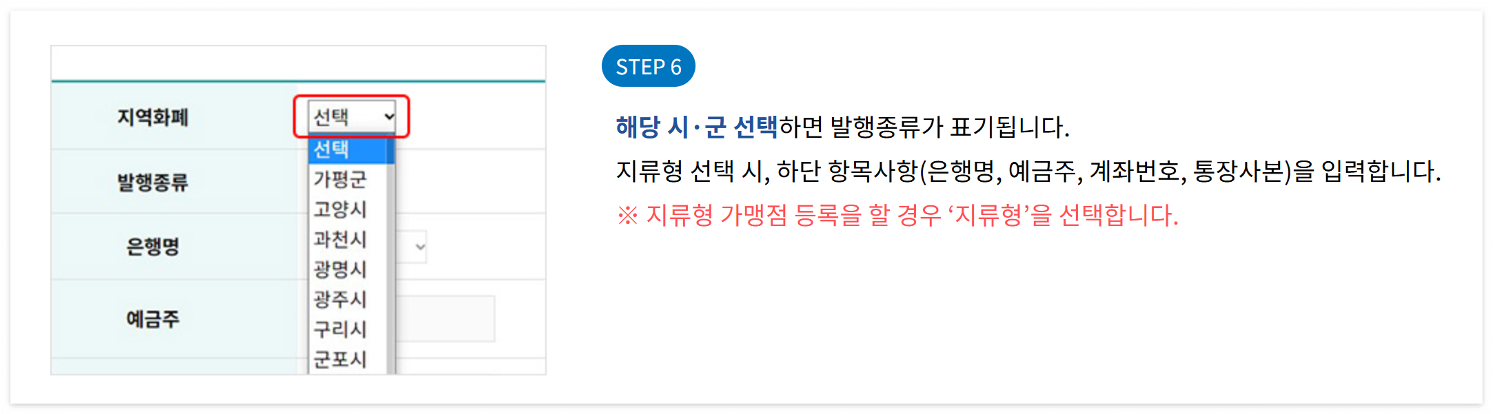 - 해당 시·군을 선택하면 가맹점 등록 유형에 따라 발행 종류가 자동으로 표기됩니다.